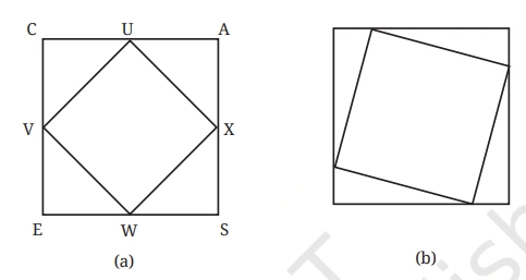 Quetsion 7: CASE is a square. The points U, V, W and X are the midpoints of the sides of the square. What type of quadrilateral is UVWX? Find this by using geometric reasoning, as well as by construction and measurement. Find other ways of constructing a square within a square such that the vertices of the inner square lie on the sides of the outer square, as shown in Figure (b).