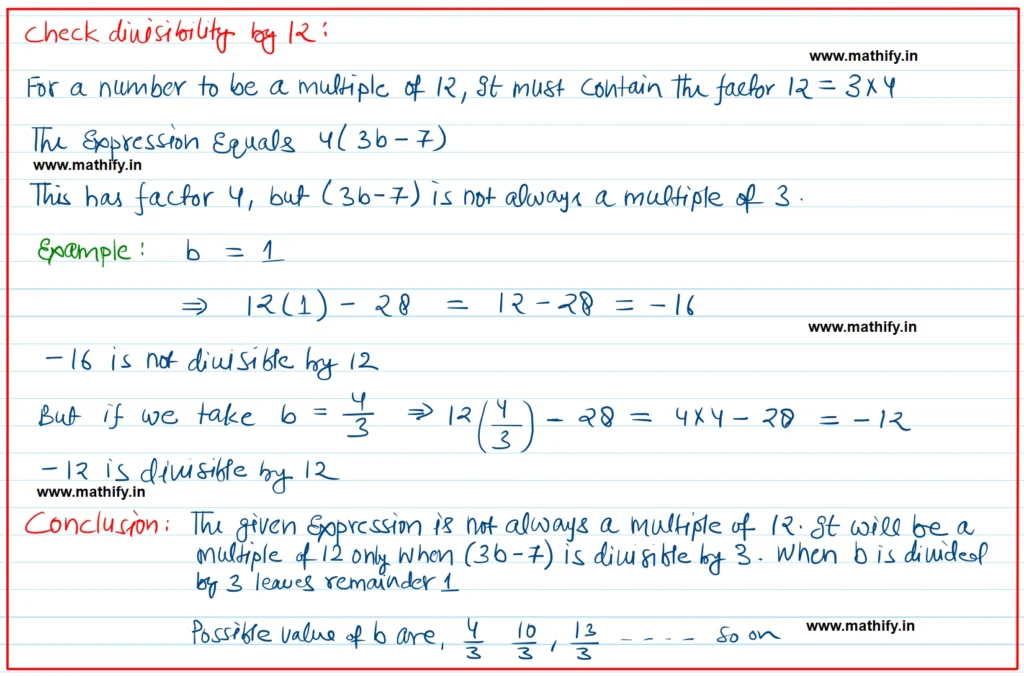 (iv) 8 (7b – 3) – 4 (11b + 1) is a multiple of 12.