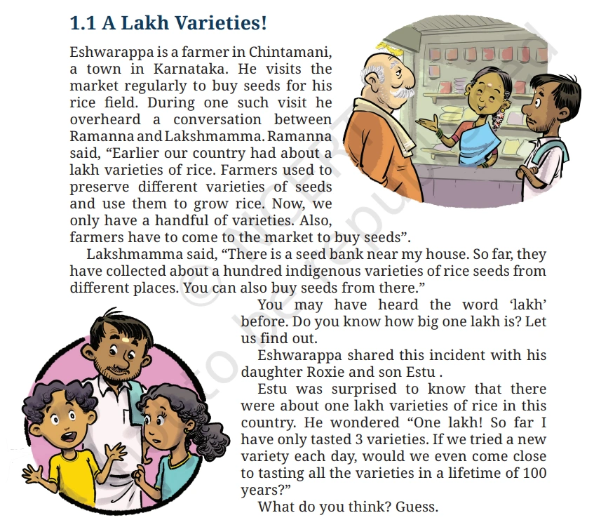 Question 1. Eshwarappa is a farmer in Chintamani, a town in Karnataka. He visits the market regularly to buy seeds for his rice field. During one such visit he overheard a conversation between Ramanna and Lakshmamma. Ramanna said, “Earlier our country had about a lakh varieties of rice. Farmers used to preserve different varieties of seeds and use them to grow rice. Now, we only have a handful of varieties. Also, farmers have to come to the market to buy seeds”. Lakshmamma said, “There is a seed bank near my house. So far, they have collected about a hundred indigenous varieties of rice seeds from different places. You can also buy seeds from there.”