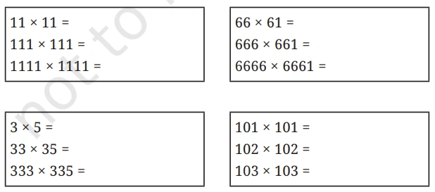Q. In each of the following boxes, the multiplications produce interesting patterns. Evaluate them to find the pattern. Extend the multiplications based on the observed pattern.