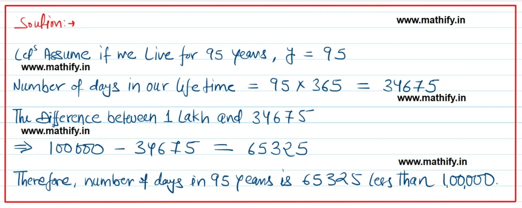 Q. 5. Estu said, “We know how many days there are in a year – 365, if we ignore leap years. If we live for y years, the number of days in our lifetime will be 365 x y.”