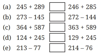 Question 2: In the boxes below, fill ‘<’, ‘>’ or ‘=’ after analysing the expressions on the LHS and RHS. Use reasoning and understanding of terms and brackets to figure this out and not by evaluating the expressions.