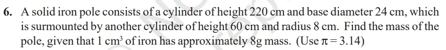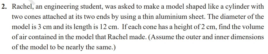 - Solving problems involving composite 3D shapes formed by combining:- Cones